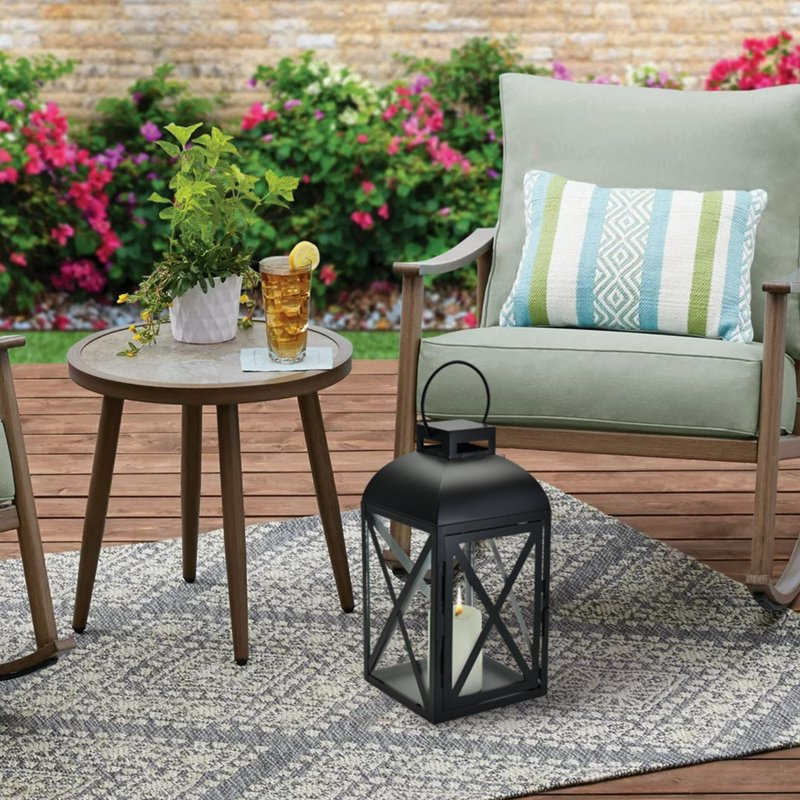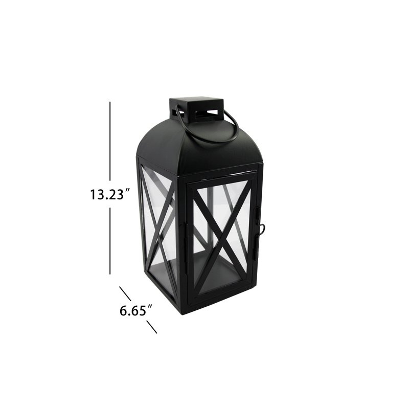Decorative Black Metal Pillar Candleholder Lantern features a rounded dome and a charming door that swings open for convenience. The swing-open door allows you to place candles in the lantern with ease as the square bottom is stable to place on any flat surface. For added convenience, a ring at the top of the lantern allows you to hang it on a stable hook, rod or any safe place that needs extra light. This lantern is a lovely addition to outdoor patio settings or indoor decoration with its durable design, crafted in steel and glass. On a warm summer evening, you can display these lanterns on your deck or part of a stylish table setting for friends and family to gather around. Only at .* Material: 85% Steel/15% Glass* Care: Wipe clean with soft, dry cloth* Country of Origin: Imported* Dimensions: 6.65" W x 6.65" D x 13.23" H* Weight: 3.58 lbs.* Holds: 1 pillar candle or tealights (sold separately)* Features: Swing-open door allows you to place candles in lantern with ease; square bottom is stable to place on any flat surface; ring at the top of the lantern allows you to hang it on a stable hook, rod or any safe place that needs extra light; glass window panels protect tealights and candles from the elements* Recommended for: Indoor and outdoor use* Warning! Never burn a candle completely and dispose of it when it burns to within 1/2" of its base or the holder. Never leave a burning candle unattended.* Decorative Black Metal Pillar Candleholder Lantern from