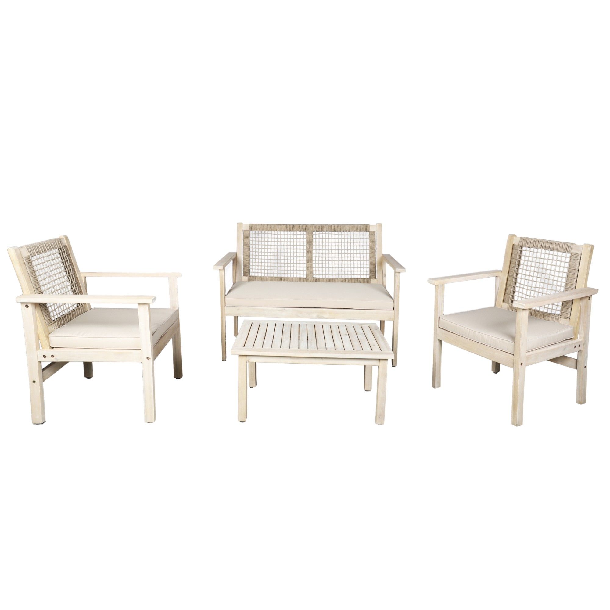 Upgrade your outdoor living space with this stylish 4-piece acacia wood patio conversation set. Designed for up to four people, this set includes a loveseat, two armchairs, and a matching coffee table—perfect for relaxing or entertaining outdoors. The solid acacia wood frame provides durability and natural charm, while the rope-woven armrests and backrests add an elegant modern touch. Thick high-density cushions deliver comfortable seating, and the detachable leg design makes assembly and storage simple. Ideal for patios, gardens, balconies, and backyards.