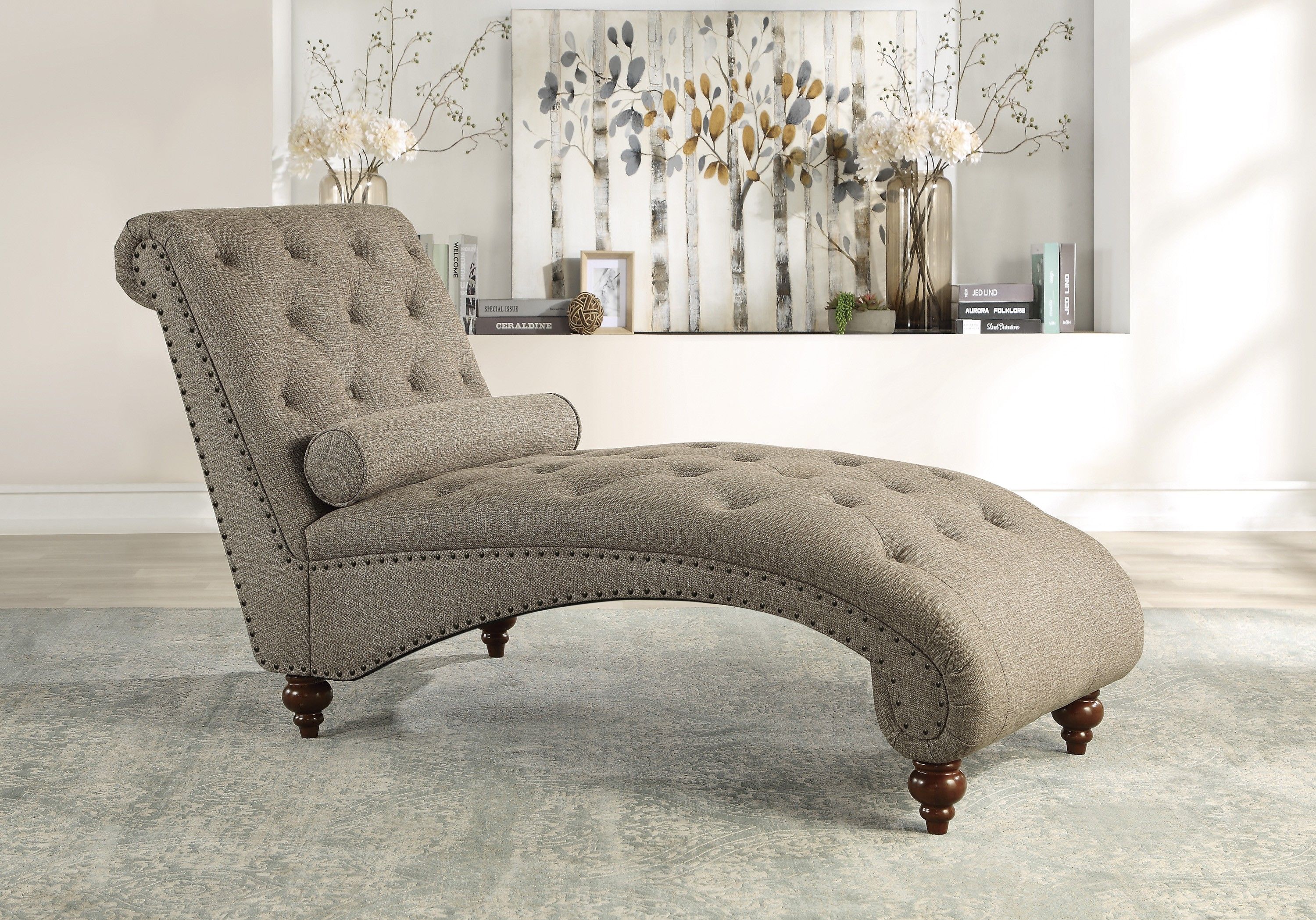 Your preference for modern traditional styling and comfort intersect in the design of the Bonne Collection. Contoured for your ultimate comfort and trimmed with traditional accents, the timeless look will be a wonderful addition to your boudoir or living room. The brown textured fabric covered chaise features button tufting, rolled bolster pillow, nailhead trim and espresso-finished turned wood legs.