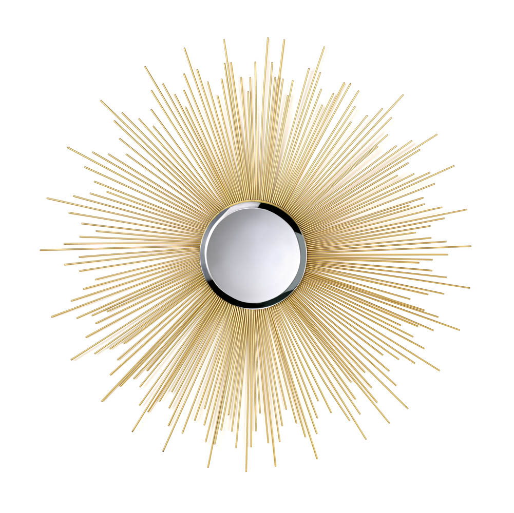 A stunning addition to any room, this gorgeous sunburst mirror takes a touch of vintage style and makes a modern masterpiece. It features a beveled mirror inset in a burst of shimmering golden sunshine rays. Item weight: 6.4 lbs. 32" x 32" high; reflective mirror 7" diameter. Iron and mirror. UPC: 849179017415.